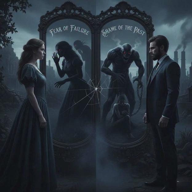 - El Espejo de la Izquierda: Representa el "Miedo al Fracaso". Una figura femenina observa cómo su reflejo se distorsiona en una sombra que susurra dudas, recordándonos que el miedo es solo una proyección que pierde poder cuando decidimos no apartar la mirada.